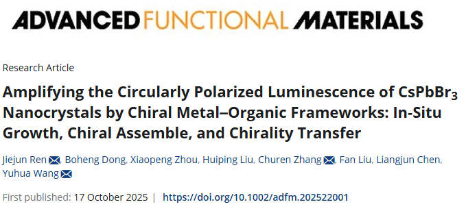 J. Ren, B. Dong, X. Zhou, et. al., Amplifying the Circularly Polarized Luminescence of CsPbBr₃ Nanocrystals by Chiral Metal–Organic Frameworks: In-Situ Growth, Chiral Assemble, and Chirality Transfer, Adv. Funct. Mater., 2025, e22001.