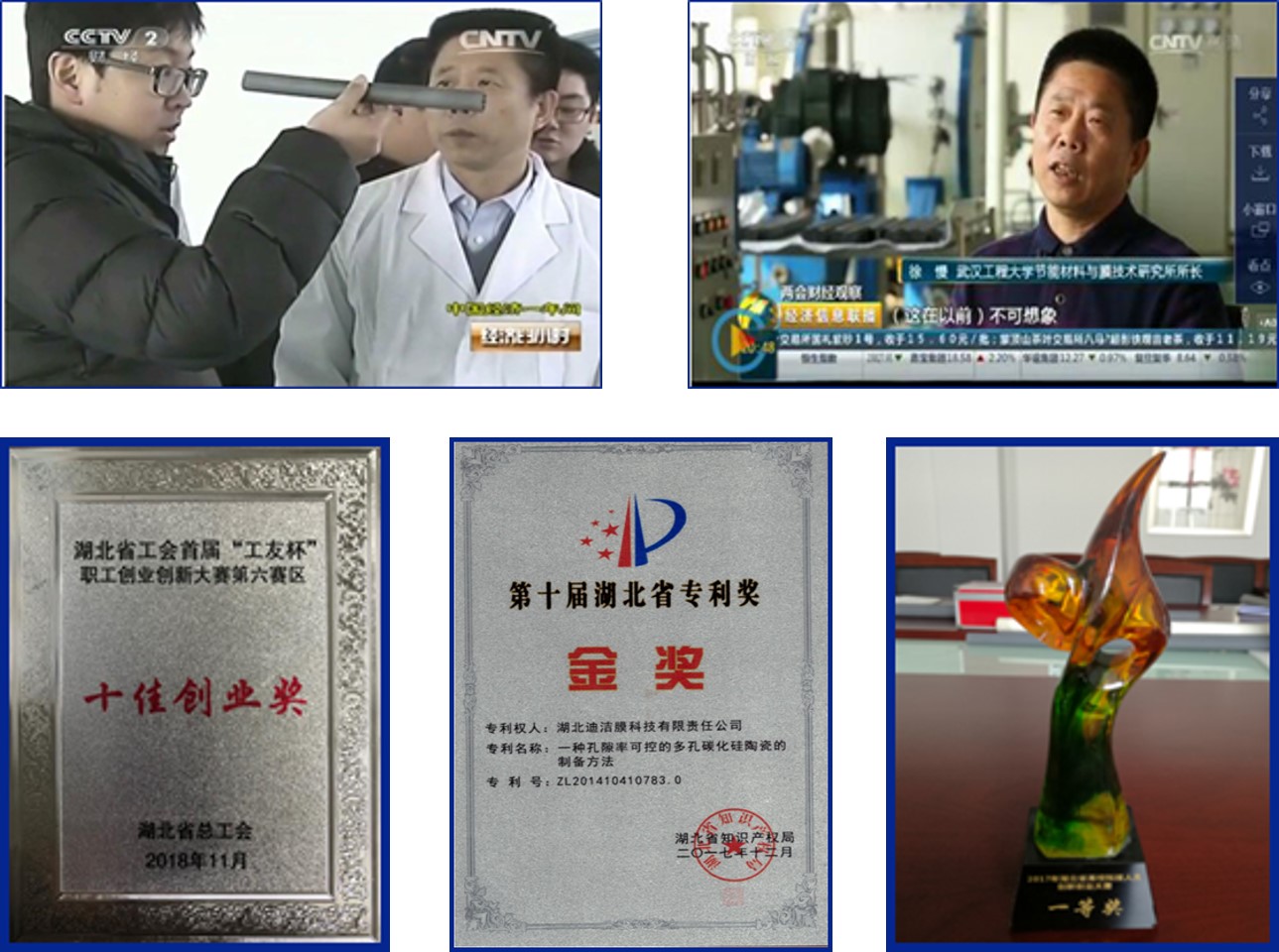 由公司徐慢教授主持的“高性能碳化硅陶瓷膜制备成套技术与产业化”项目以第一完成单位喜获湖北省科技一等奖,该项目瞄准高性能膜材料在化工领域应用方面的重大需求,发明了反应烧结、复合重结晶烧结制备多孔纯碳化硅陶瓷的方法和基于毛细过滤吸浆与液压协同控制的浆料涂敷工艺与设备,开发出涵盖微滤、超滤的系列非对称多通道碳化硅陶瓷膜,建成了国内首条高性能碳化硅陶瓷膜生产线,建立了碳化硅陶瓷膜生产质量控制体系,实现了成品率达85%的稳定生产。
