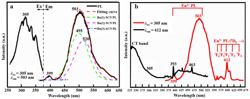 如图1所示,徐慢教授团队分析了不同气氛下制备的BMSO:Eu的PLE和PL光谱。还原气氛下制备的BMSO:Eu2+荧光粉在紫外区有一个宽激发带,而发射光谱位于360~650 nm范围内,在399和503 nm处有2个发射峰。作为一种绿色成分,这种亮绿色荧光粉在wLED中具有潜在的应用价值。当在空气条件下制备Eu掺杂荧光粉时,会出现自还原现象,部分Eu3+被还原成Eu2+,因此光致激发和发射图谱应同时包括Eu3+和Eu2+光谱。在监测λex=305 nm时,可以观察到Eu3+的数个尖锐的发射峰,最大的发射峰位于612 nm,对应于5D0→7F2电偶极跃迁,因此判断Eu3+占据无反演对称中心的Ba2+位点,反过来也证明了Eu3+可以作为一种有效的结构探测离子,同时提供了wLED所需的红色成分。