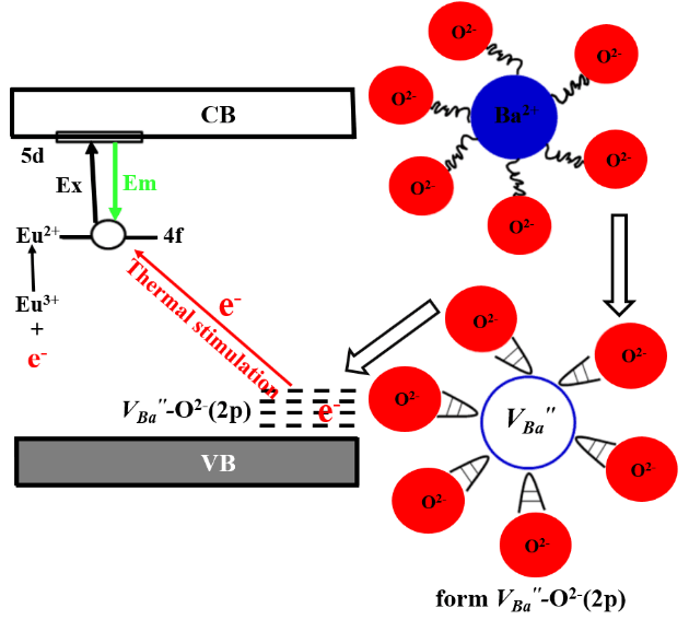 由阳离子空位(VBa′′)构成的缺陷必须由氧离子包围(例如6或9配位)(图2)。由于静电原因,带负电的缺陷将位于Eu3+阳离子附近,因为它们被认为是带正电的缺陷。因此,VBa′′将诱导位于BMSO主晶格价带和导带之间的局部能级。这些供体能级建立在指向空位的O轨道(长对)上,因此预计位于价带的正上方。整个自还原过程如图2所示。另外,BMSO的晶体结构在退火过程中也起到防止Eu2+被氧化的作用。因此,在空气条件下合成的BMSO:Eu中同时存在Eu2+和Eu3+。