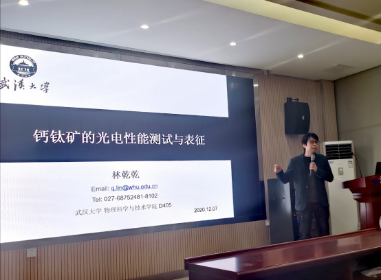 基于钙钛矿材料的光电器件在太阳能电池、发光二极管和光电探测器等领域取得了日新月异的进展,然而由于钙钛矿材料的结构无序和复杂多变,使其光电性能的系统性认识明显不足。因此,研究钙钛矿材料的结构性能关系,以及相关器件设计的探索显得极为迫切和重要。在学术报告中,林乾乾教授针对以上问题,详细介绍和比较了几种常用的光电表征方法,包括瞬态和稳态的电学表征,还有常用的几种光谱学表征技术。之后,林教授结合以上光电表征方法,简单介绍自己对于光电器件设计方面的理解。报告结束后,林教授与在场师生进行了热情的交流互动,详细回答了现场师生的提问,并给出自己的看法和建议。