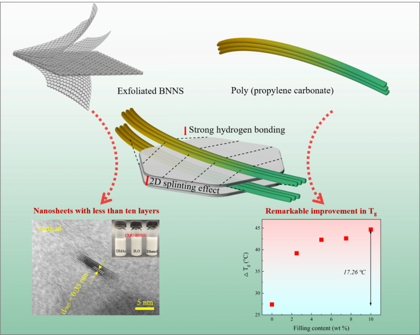 在高分子材料耐热改性方面,填充无机填料限制高分子基体分子链运动是一种有效的方法。江学良教授课题组首次将羧甲基纤维素钠(CMC-Na)用于六角氮化硼(h-BN)的剥离和功能化,通过剥离后氮化硼纳米片(BNNS)层与层之间的“夹板效应”来限制PPC分子链段运动的方法,所制备的PPC/CMC-BNNS复合材料不仅具有优异的耐热性,而且具有更好的导热性和热稳定性。当BNNS填充量为10wt%时,可使PPC复合材料的玻璃化温度提升至39.19˚C,极大提高了PPC耐热应用范围。这项工作为可生物降解聚合物的二维材料剥离和耐热改性提供了一条新途径。
