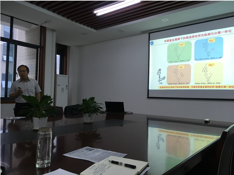 徐林博士首先对超分子化学的基本情况和研究背景进行了讲解,然后从荧光探针的基础知识引入,详细介绍了基于H2S生物信号小分子荧光探针、利用金属复合物实现组氨酸识别进行重金属污染物离子检测、配位键导向自组装和三维组装超分子等研究内容。报告最后,徐林博士详细回答了参会教师和员工的相关提问,并鼓励员工要努力学习,争取在攻读研究生期间抓住学习的机会,努力提升自己的科学研究能力。整场报告深入浅出,现场师生互动,气氛活跃,师生获益匪浅。
