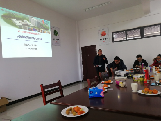 新能源材料与器件教研室胡六永博士作为第一期报告人,做了题为《从光电探测到光电化学传感》的学术报告。从PEC生物传感器的信号放大策略和传感机制着手,围绕高效光活性材料的设计与制备、肿瘤标志物检测、食品安全分析、环境监测等方向介绍了相关研究进展。报告结束后,与会师生热烈讨论了相关研究方向,展望了后续的研究合作,相互交流了有关公司产品等方面的经验。