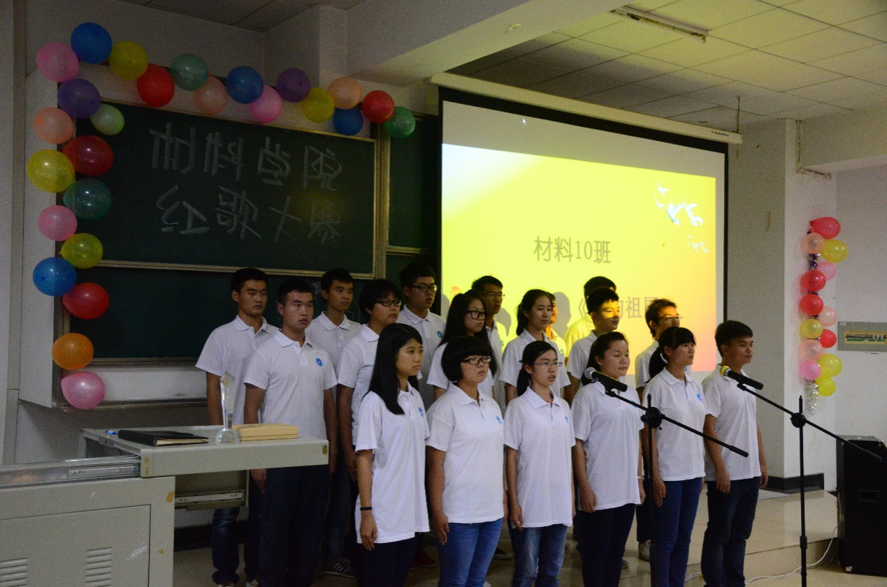 在四名主持人介绍过大赛的评分规则后,比赛正式开始。按照赛前的抽签顺序,材料8班第一个上台表演。他们用诗朗诵加歌曲联唱的方式把他们对祖国的热爱表现的淋漓尽致。材料6班的《大中国》和材料5班带来的《我的中国心》将他们作为中国人的自豪感表现的淋漓尽致。之后,由材料4班带来的《中国军魂》似乎把我们带回到了战争年代,光荣的战士们奋勇杀敌,在一声声“向前进”中把帝国主义的铁蹄赶出中国。而E+材料化学班为我们带来的《喀秋莎》更是体现的全世界对反法西斯的坚定决心。在材料1班的合唱《国家》和材料15班带来的《歌唱祖国》中,整齐洪亮的歌声让我们看的了新中国在中国共产党带领下的繁荣富强。材料11班的