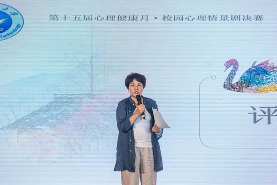 刘琼珍老师曾在初赛前准备阶段为各代表队进行专业培训,此次决赛中,从技术、选题、演绎等方面对各决赛队伍进行逐一点评,鼓励在场同学在剧中思考、在生活中进行有效的自我调节。