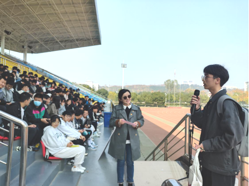 他提到,大一的关键词是探索,要不断尝试探索,为今后找好方向;大二的关键词是选择,要找到兴趣点,明确未来规划;大三的关键词是奋斗,要由更高的目标和要求;大四的关键词是圆梦,实现大一的目标并展望更远的未来。