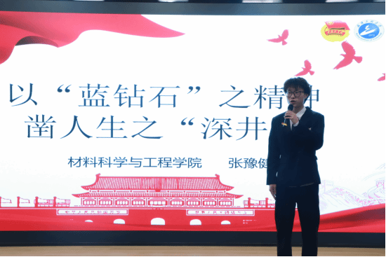 他作为“蓝钻石”的一员,愿接过前辈们的接力棒,胸怀报国之志,常怀感恩之心,以“越是艰险越向前”的勇毅自觉向上攀登、逆风飞翔,努力成长为“全面过硬,多面闪光”的钻石型人才,在青春的奋斗路上凿出“人生最深的井”。