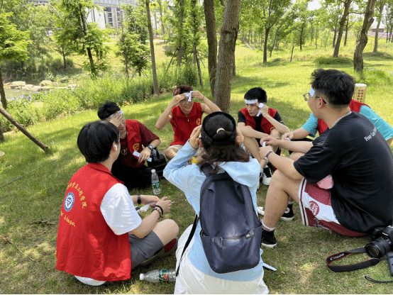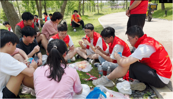 随后,同学们围着坐成一圈,在补给水和食物后,开展团建活动。每名同学都沉浸在卡牌游戏和猜字游戏的欢乐中,脸上洋溢着笑容。