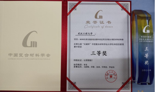 本届大赛历经报名、资格审查、赛区初赛、全国总决赛,由李亮老师指导,冯新畅、师雯、吴涛、何明宏、孛金钰组建的团队经过几轮激烈的角逐,项目“MXene在柔性超级电容器中的应用及其复合凝胶材料的制备”在全国七大赛区77所高校的204支参赛队伍中脱颖而出,进入到全国总决赛。决赛中团队表现突出,获得了专家评委的一致好评何认可,获得竞赛三等奖。