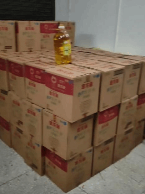 在进行简单的交接后,便是繁重的卸货过程,本批物资共有257袋米和267桶油,工作量巨大,但志愿者们不惧困难和劳累,合理运用劳动人民的智慧,与村干部一起用人工接力的方式有条不紊从车上开始卸物资。