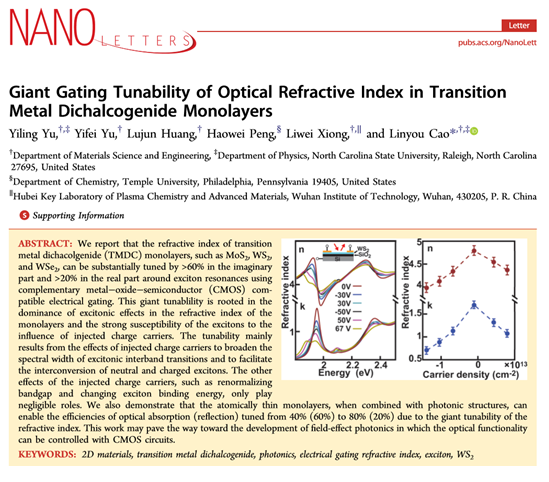 (通讯员 刘顺红)2017年5月15日,国际知名学术期刊Nano Letters(2015年影响因子13.779)在线发表了公司英国正版365熊礼威副教授与美国北卡州立大学合作完成的最新研究成果:Giant Gating Tunability of Optical Refractive Index in Transition Metal Dichalcogenide Monolayers。