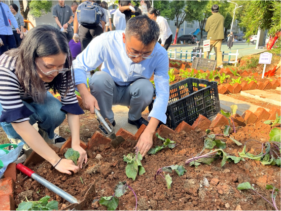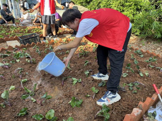 活动伊始,在秋日的暖阳下,师生们共同协作,经过观摩学习后,动手分苗、铲土、翻地、种苗、填土、浇水,齐心协力栽种菜苔,体验劳动的快乐。