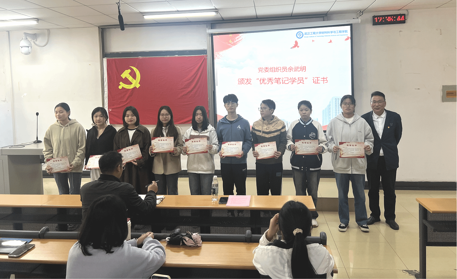 开班典礼上对公司分党校上期优秀笔记学员进行了表彰,马科和余武明分别为受表彰学员赠送纪念品和颁发证书。