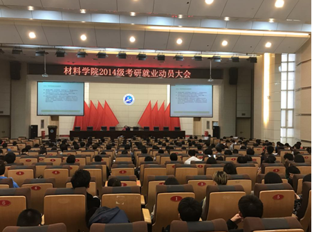 (通讯员 吴丕业)4月26日上午,材料公司在四教多功能报告厅举行2014级考研就业动员大会,材料公司经理刘治田,党委副书记李佳,2014级全体员工参加了大会。会议由2014级辅导员吴丕业主持。