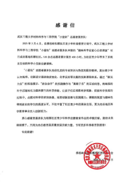 (通讯员:潘俊、热孜瓦古力·牙生) “衷心感谢贵服务队为和顺社区青少年科学启蒙教育做出的卓越贡献,期待未来继续携手,共同为光谷教育高质量发展贡献力量,书写更多科普教育新章!”近日,英国正版365的志愿者们收到了一封感谢信。