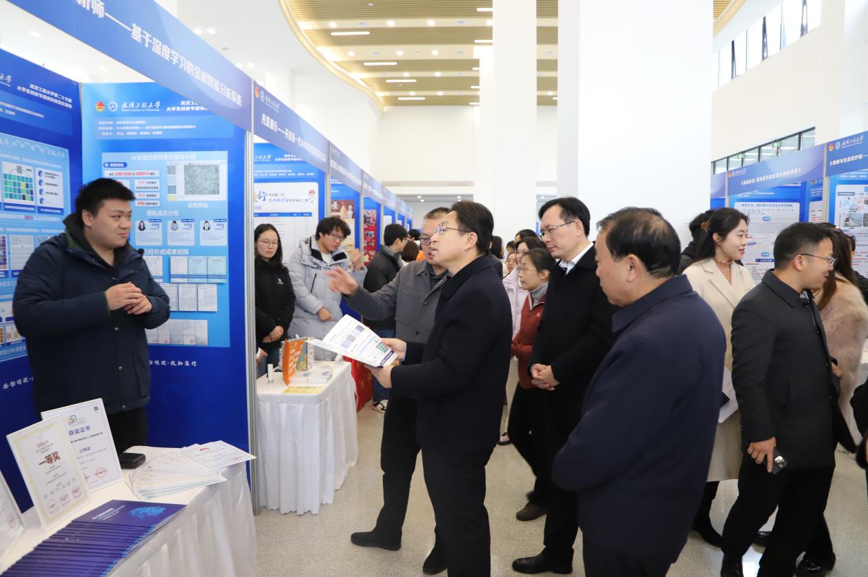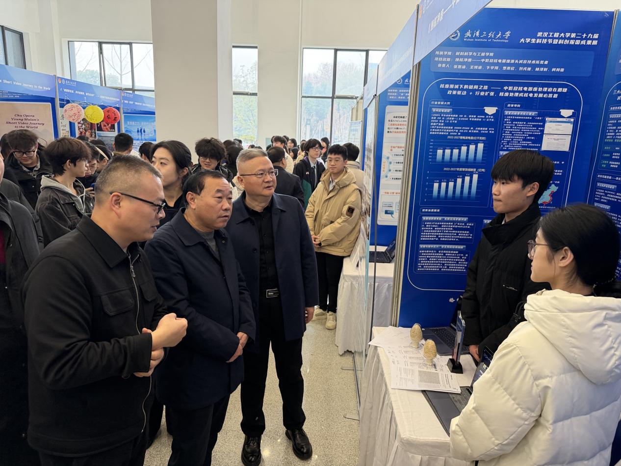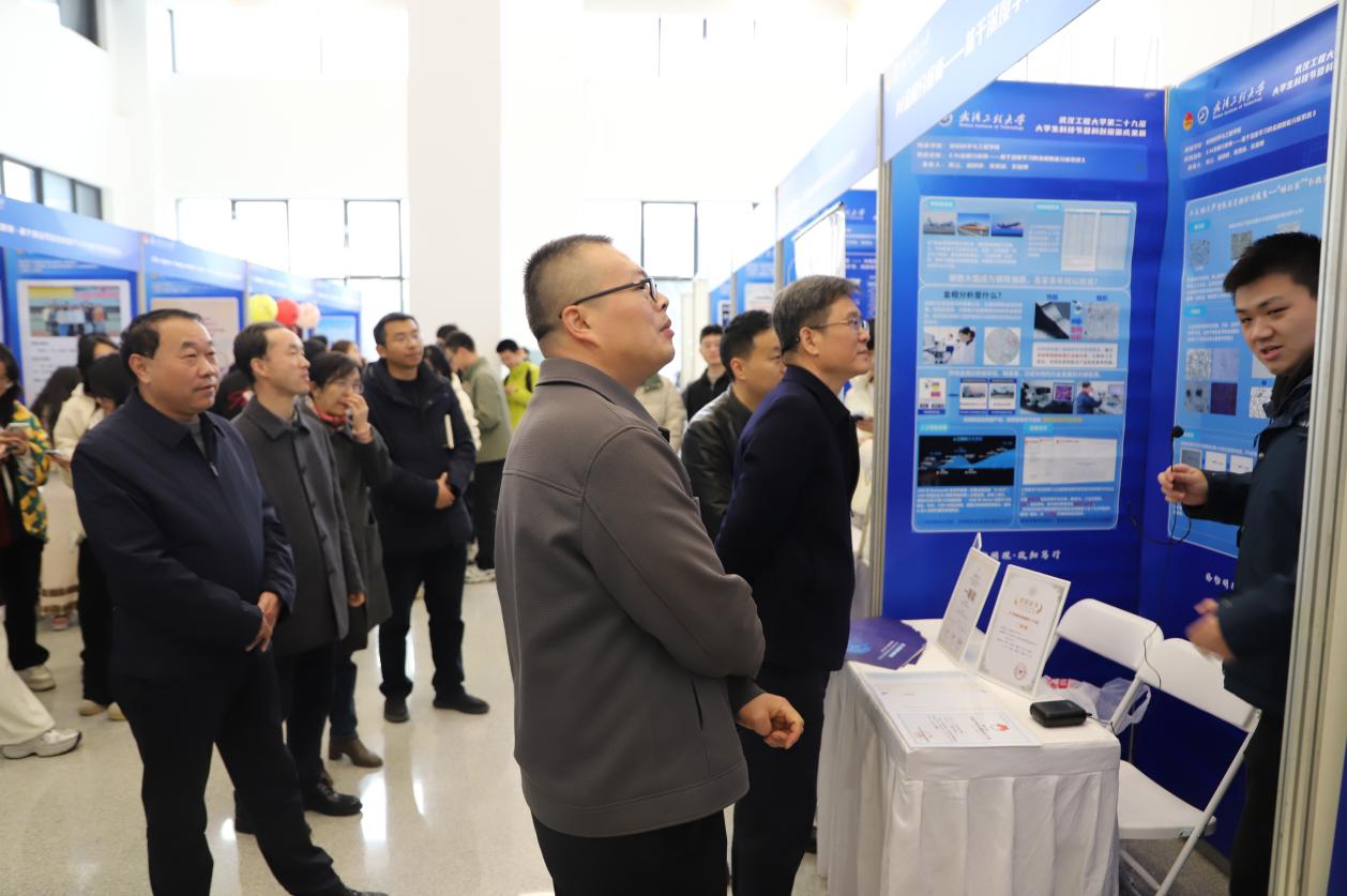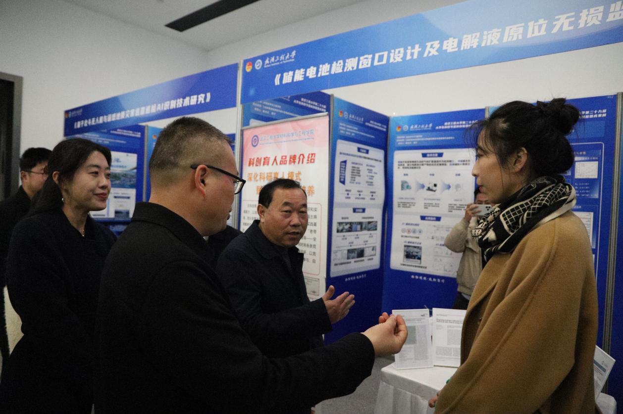 布展期间,公司党委书记汪伟、董事长张彦铎、公司党委副书记李志旭、副董事长马小龙等校领导、各职能部门负责人、公司领导、校外专家及公司师生前往展区参观,参展团队的员工代表们热情地讲解项目背景、技术原理、创新点及应用前景。他们自信而专业地阐述,展现了材料学子扎实的专业功底、活跃的创新思维和将论文写在祖国大地上的青春抱负。许多同学在观摩后表示,深受启发与鼓舞,对参与科技创新活动充满了期待。
