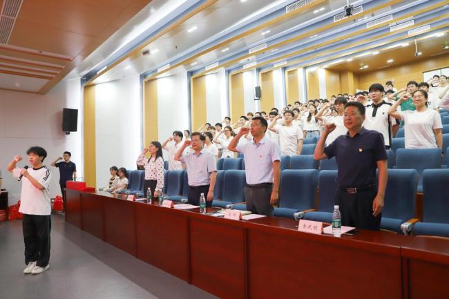 大会在国歌声中拉开帷幕。组织员余武明宣读新党员名单后,毕业生党员为新党员佩戴党徽、赠送党章,全体党员在党旗下重温入党誓词,坚定永远跟党走的决心。