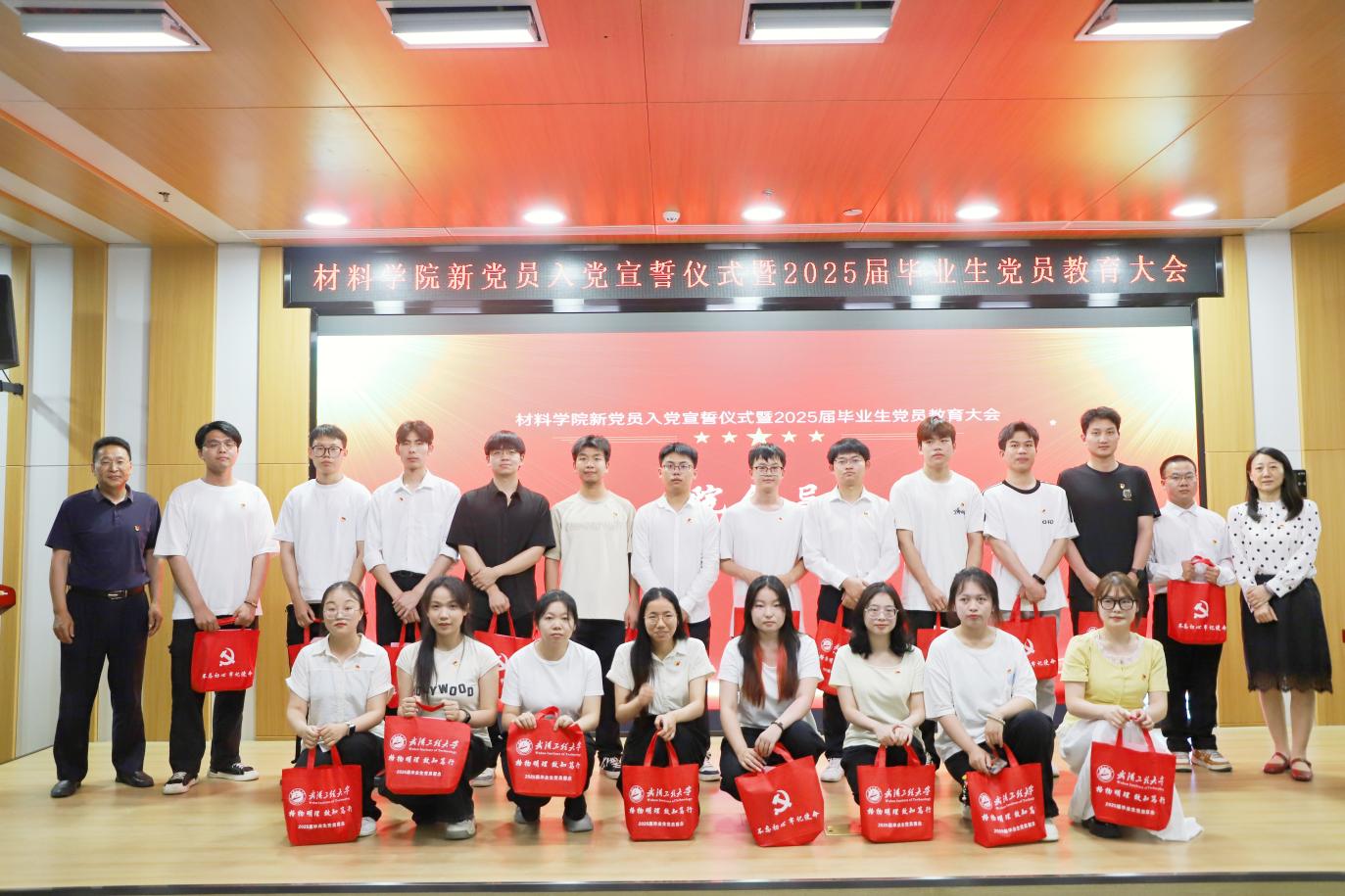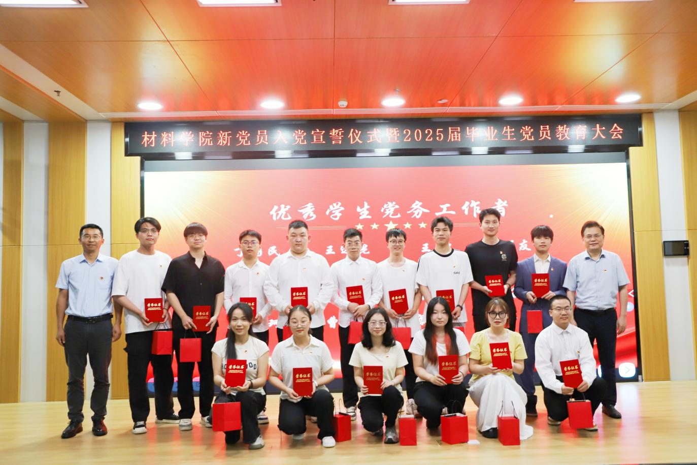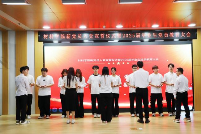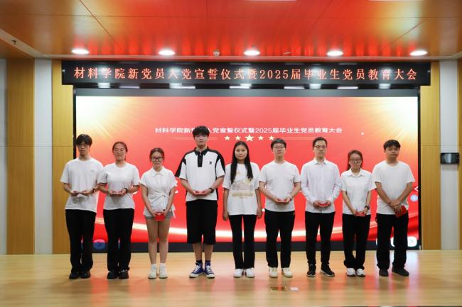 江学良在讲话中向毕业生党员祝贺、新党员欢迎,并对党员提出四点期望:一是以信仰为基,将个人理想融入国家需求,以党章为镜;二是以实干为要,践行“工于至善 筑梦成材”院训,争做“大国工匠”;三是以担当为荣,在芯片材料等关键领域担当,让材料科学服务人民;四是以母校为念,传承“工于至善”精神,以“信仰是灯塔、奋斗是底色、担当是本分”与党员共勉。