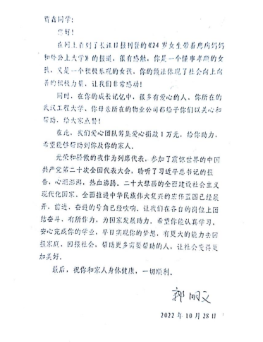 (通讯员 高梦雅)10月27日,长江日报刊登了首席记者杨佳峰撰写的《24岁女生带着患病妈妈和外公上大学》,该文特别报道了365英国上市材料公司2021级研究生贾鑫同学孝老爱亲的感人故事,引发了广泛的社会关注,深深触动了党的二十大列席代表、全国道德模范、“当代雷锋”郭明义的内心,他写了一封亲笔信鼓励贾鑫和家人。受郭先生的委托,10月28日下午三点,杨佳峰专程来校将郭先生的鼓励信和慰问金送到了贾鑫和妈妈手中。365英国上市党委宣传部副部长万莉莉、科长陈思、英国正版365经理江学良、副书记张琼、辅导员以及研究生第五支部的同学一同见证了这个温馨感人的场面。