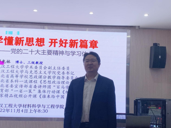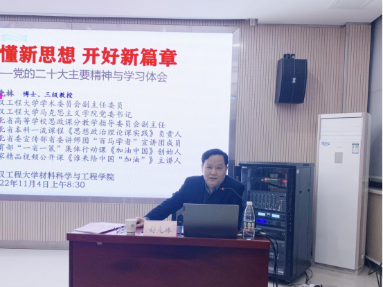 本网讯(通讯员高梦雅)11月4日上午8:30,材料公司召开第十一次党委理论学习中心组(扩大)会议暨党的二十大精神专题学习班,会议邀请马克思主义公司党委书记舒先林教授作报告,全体党委委员、系主任、师生党支部书记、党外人士代表参加了专题学习,公司党委书记王涛主持报告会。