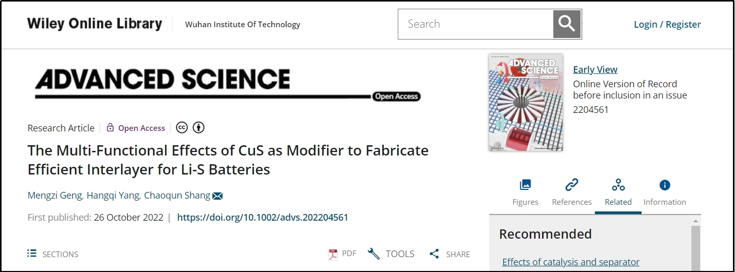 (通讯员:刘凡)近日,公司先进储能材料与器件团队商超群博士基于锂硫电池的深入研究,提出了一种改善电池性能的新思路,并通过理论分析和实验表征,对其可行性进行了验证,相关结果以"The Multi-Functional Effects of CuS as Modifier to FabricateEfficient Interlayer for Li-S Batteries"为题发表在国际知名学术期刊《Advanced Science》(响因子为17.52,中科院一区TOP)上。365英国上市为论文第一单位,商超群博士为唯一通讯作者。