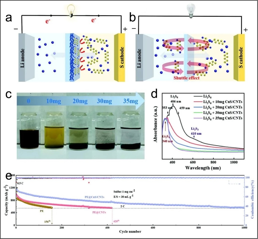图(a)CuS/CNTs改性效果vs. (b)未改性示意图,(c)多硫化物极限吸附量与(d)相应UV-Vis,(e)循环性能。