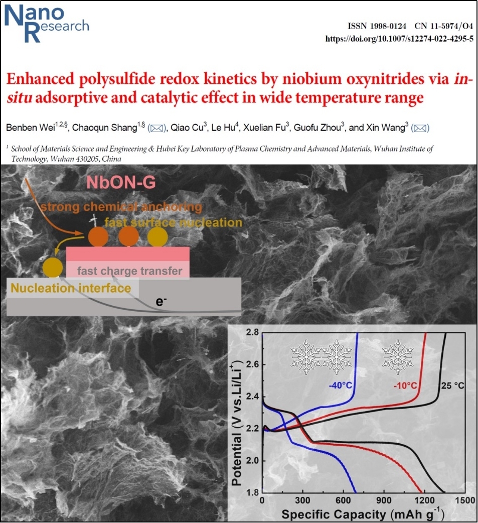 (1)以极性金属氧化物对硫物种具有高吸附性、导电金属氮化物能增快电子传输和硫物种的氧化还原反应为出发点,综合两者优点,合理设计分散在石墨烯上的氮氧化铌(NbON-G)作为隔膜改性,促进多硫化锂的原位化学吸附和催化转化,使其在较宽的温度范围内表现出优异的电化学稳定性,该研究为锂硫电池在温度恶劣条件下的应用提供了可能(﹣40°C),以"Enhanced polysulfide redox kinetics by niobium oxynitrides via in-situ adsorptive and catalytic effect in wide temperature range"为题发表在材料科学领域高水平期刊《Nano Research》(影响因子为10.27,中科院一区TOP)。