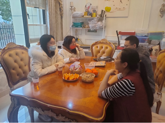 家访队首先来到2021级员工段同学家中,段同学寒假期间突发气胸,经过一段时间住院治疗,现在在家调养。张琼非常关心了他的恢复情况,为他送上了牛奶、麦片,嘱咐他注意补充营养、适量运动,提高身体免疫力。马上进入新的学期,芦梦荻鼓励段一鸣在学习上树立合适目标,争取成绩更上一层楼,在生活上要走出宿舍,多参加活动、多与同学们交流,提高社交能力。员工家长感谢了公司对员工的关心,表示会和公司一起努力,在学习和生活上支持和鼓励员工不断进步。