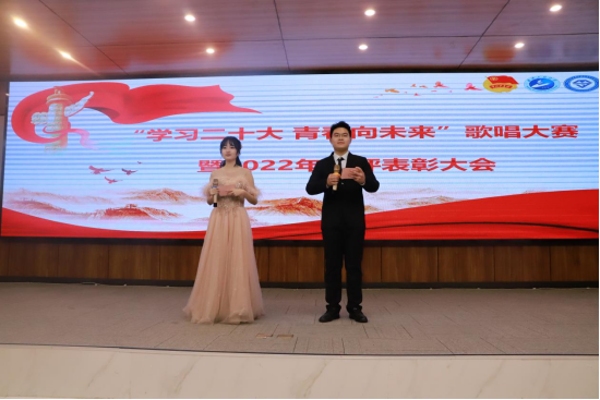 本网讯(通讯员 张茜 热孜瓦古力·牙生)3月4日晚,材料公司在图灵报告厅举行“学习党的二十大 青春向未来”双评表彰大会暨歌唱比赛。校团委副书记翟莹、材料公司党委副书记张琼、辅导员柯贤忠、芦梦荻、张茜、热孜瓦古力、优秀员工代表以及11个参赛队伍共200余人参与此次活动。