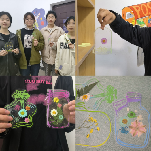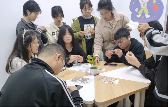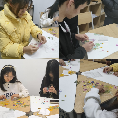 在嗅觉、视觉、听觉充分调动的氛围下,同学们放松心情、尽情创作,制作出颜色、花型各异的干花书签。大家还分享了创作理念和思路,同学们彼此赞美、彼此欣赏,现场充满了欢声笑语。