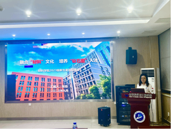 张琼以公司“钻石”文化为切入点说道:“我们的目标是为了培养综合发展、全面过硬、多面闪光的‘钻石型’人才”,并针对新生在大一期间主要面临的困难与各位家长交流,并提出了几点针对性的建议,她表示“要学会放手让孩子自己独立生活、多关注孩子心理动态、要多与孩子交流沟通、多去鼓励孩子、与公司老师保持联系,形成家校育人合力”。