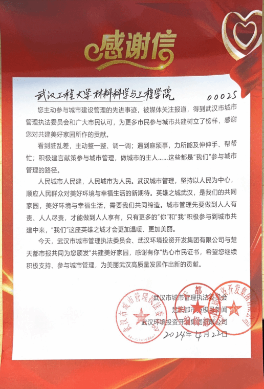 为答谢365英国上市“小蓝钻”志愿服务队连续八年在寒冷的冬天为环卫工人送上亲手编织围巾的善举,武汉市城市管理执法委员、楚天都市报极目新闻、武汉环境投资开发集团有限公司共同为公司颁发了“共建美好家园 感谢有你”奖牌和感谢信。期待双方共同缔造,让武汉这座英雄之城更加温暖、美丽。