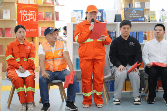 徐迪迪代表公司向东湖开发区城管局领导嘉宾、环卫工人朋友们的到来表示热烈的欢迎。她指出材料公司“温暖城市园丁”活动连续开展了八年,公司与城管局、老员工与环卫工人结下了深厚的情谊,共同向社会传递了尊重劳动者、关爱环卫工人、共建美丽城市的理念。本次活动是该项目的一个创新举措,她向大家发起倡议:要培养“敏而好学,不耻下问”的学习态度,对未知的事物保持好奇和渴望,永葆学习的热情和动力;要发扬“故书不厌百回读,熟读深思子自知”的钻研精神,选择经典书籍进行反复阅读,深入挖掘知识的内涵和外延;要磨砺“书山有路勤为径,学海无涯苦作舟”的坚毅品质,将阅读作为终身学习的事业,在书香的浸润下修身养性,深切感受生命的辽阔和人生的真谛。