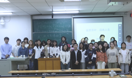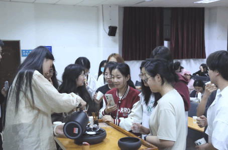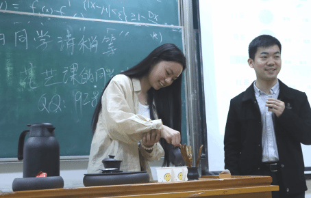 同学们了解基础知识后,晏智邀请感兴趣的同学上台进行茶艺展示,“茶艺中蕴含了古韵美、色彩美、汤色美等美之相,大家可以好好感受一下。”在温和的讲解、典雅的音乐配合下,淡淡的茶香逐渐充满了整间教室,同学们不由自主走上讲台共同参与到品茗中来。
